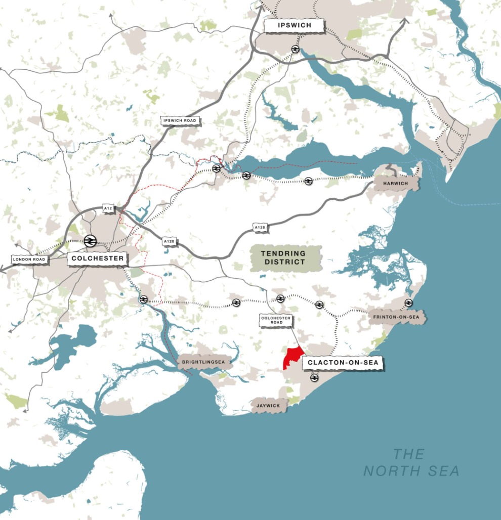 1.19. A renaissance of the seafront has been underway in the form of a coastal defence project from Clacton-on-Sea Pier to Holland Haven. This coastal protection scheme has provided 23 new beaches along the 5km coastal stretch. Clacton-on-Sea is an easily accessible town with convenient links by road, train, bus, and nearby connections for travel by sea and air. The centre of London is just over an hour away by car, bus, and train. Tendring District lies on the eastern boundary of the City of Colchester within Essex.