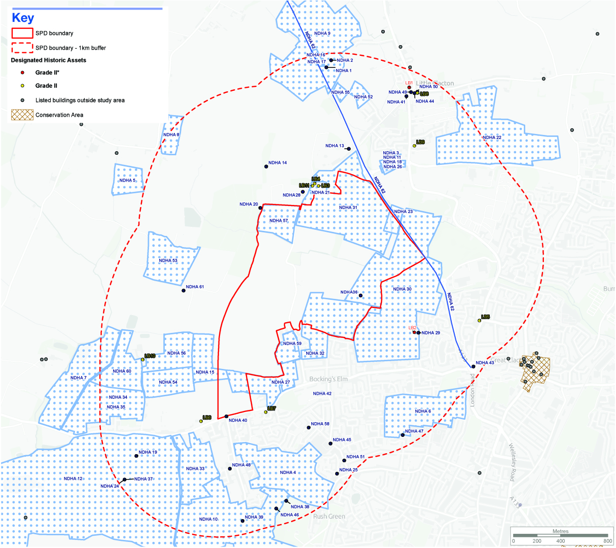 2.20. There are no world heritage sites, scheduled monuments, conservation areas, registered parks and gardens, or registered battlefields on or adjacent to the Site. There are eleven designated heritage assets within the 1km study area, comprising two Grade II* Listed Buildings and nine Grade II Listed Buildings. The closest heritage asset is Bovill's Hall directly north of the Site: