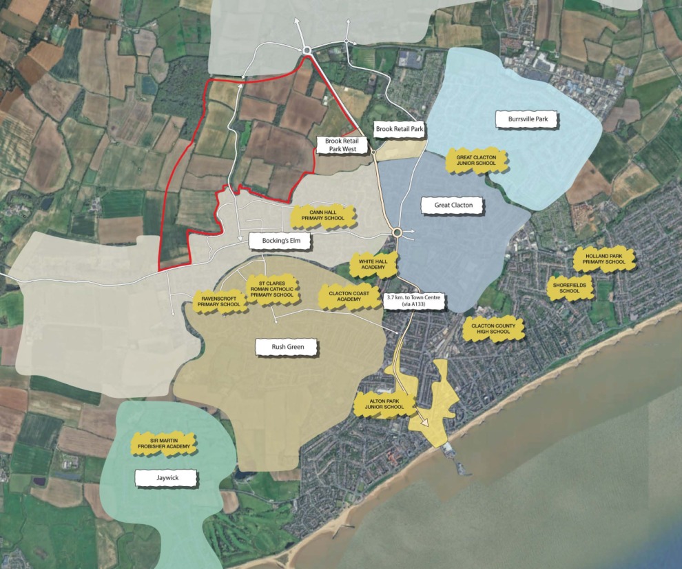 2.4. A residential suburb of Clacton-on-Sea, Bocking's Elm, located directly to the south of the Site, benefits from a variety of open spaces serving local residents, creating core focal points within the neighbourhood. The structure of Bocking's Elm is predominantly cul-de-sac residential roads of two storey homes with the principal streets of Constable Avenue and Bocking's Grove forming the main residential roads serving the neighbourhood.
